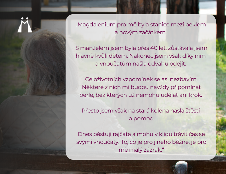 Domácí násilí v ČR zažívají tisíce lidí. Odchod z násilí a vyrovnávání se s jeho následky vyžaduje nejen velkou dávku odvahy, ale především podporu. V Magdaleniu již více než 25 let poskytujeme bezpečný prostor, důvěrný kontakt a komplexní odbornou pomoc lidem ohroženým domácím násilím.